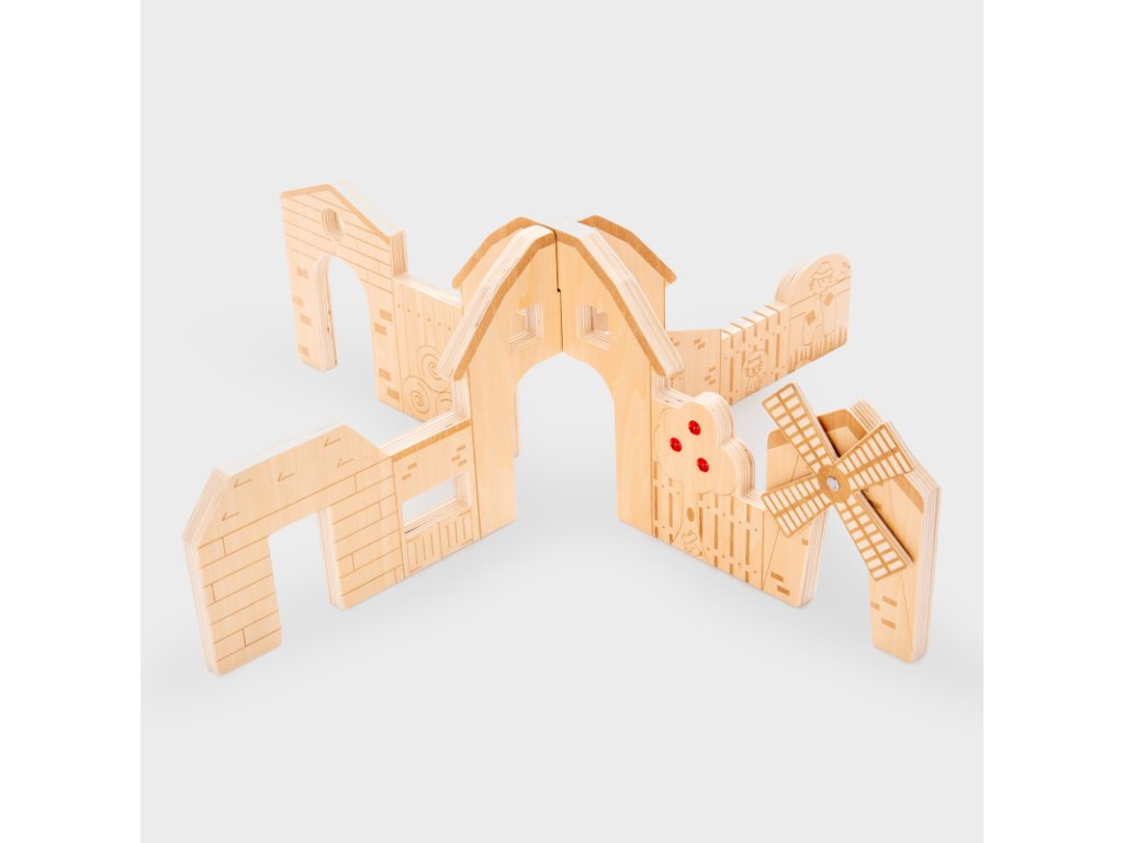 Tyto dělicí stěny, vyřezávané laserem s hmatovými prvky a postavičkami, ovocným stromem posetým drahokamy a pohyblivým větrným mlýnem, představují ideální pomůcku pro děti k vytváření herních scén v malém světě.