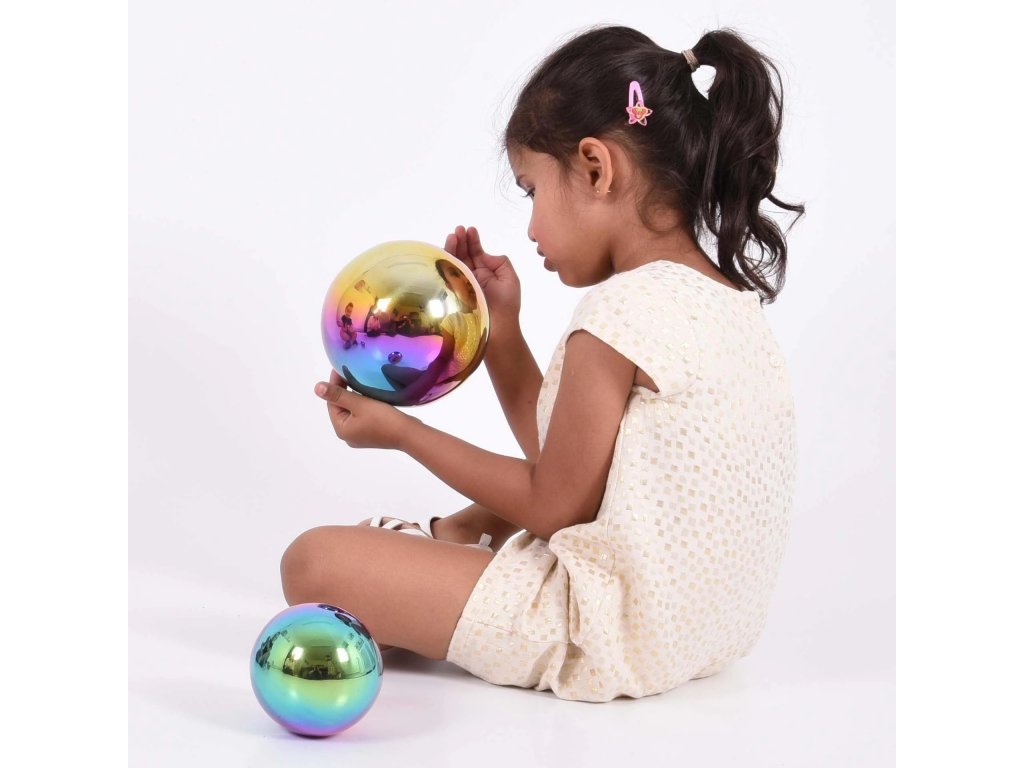 Těchto 6 míčků má své vlastní jedinečné vlastnosti, takže se každý chová jinak. Bude se kývat? Otřást? Nebo chrastit? Každý hod, zatřesen nebo roztočení záhadné koule bude lákat pozornost vašeho dítě! Každá senzorická koule je vyrobena z robustní nerezové oceli, díky čemuž je hladká, lehká a extrémně hmatová. Jejich atraktivní barvy modrá, zelená, zlatá, růžová, stříbrná a barevná mají ručně upravený zrcadlový povrch, který vytváří širokoúhlý zkreslený odraz. Poskytuje inspiraci a stimulaci pro komunikační dovednosti a slovní zásobu.