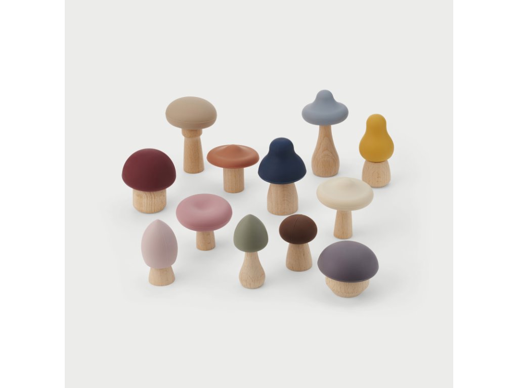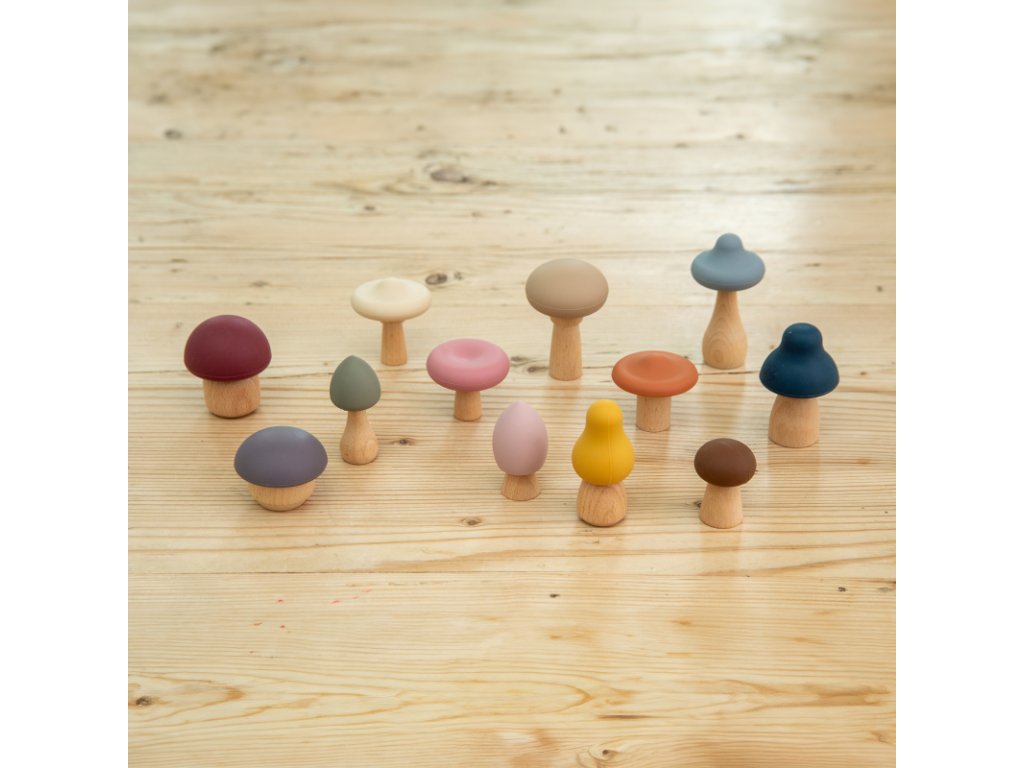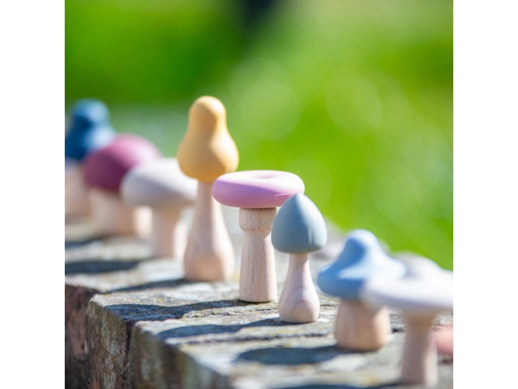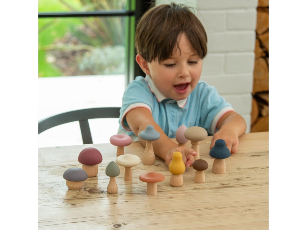 Nádherné houby různých tvarů s dřevěnými stonky a barevnými silikonovými kloboučky, které se dají oddělit a kombinovat. Jsou ideální pro jemnou motoriku a kreativní hru.