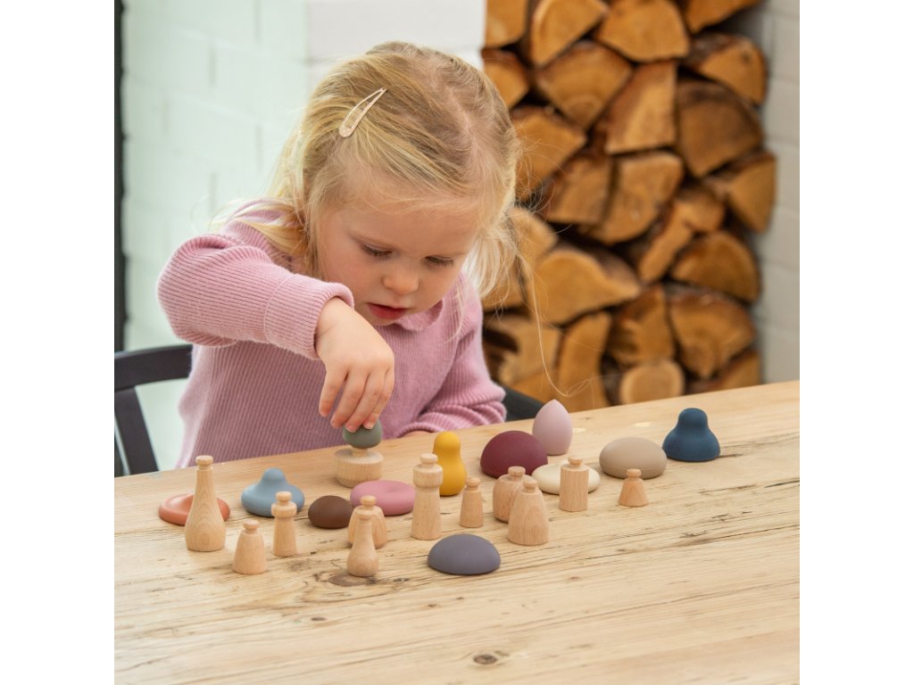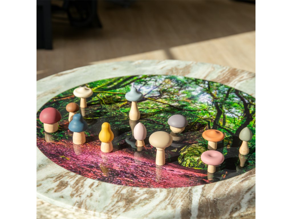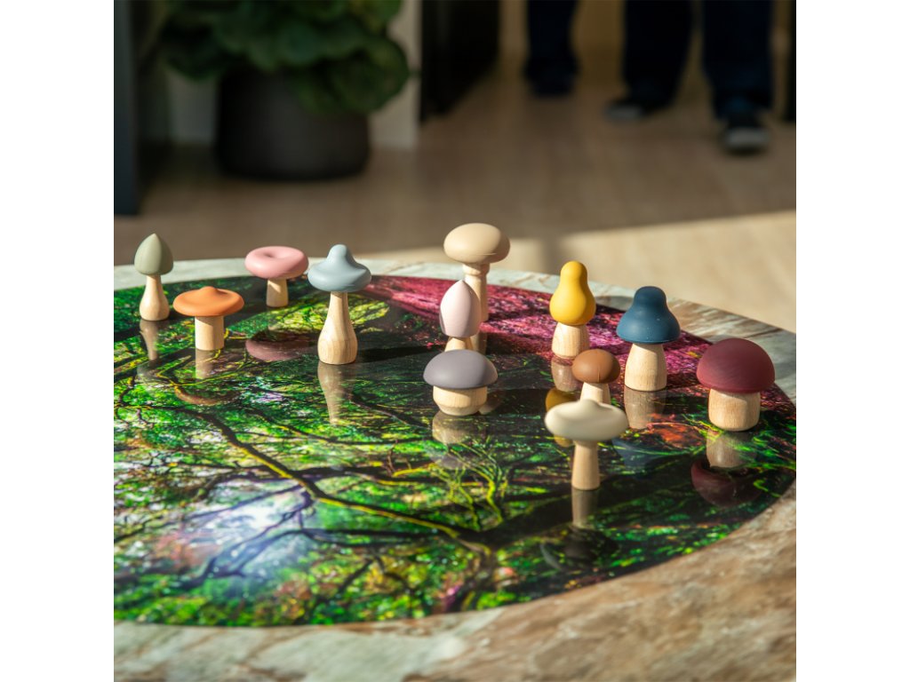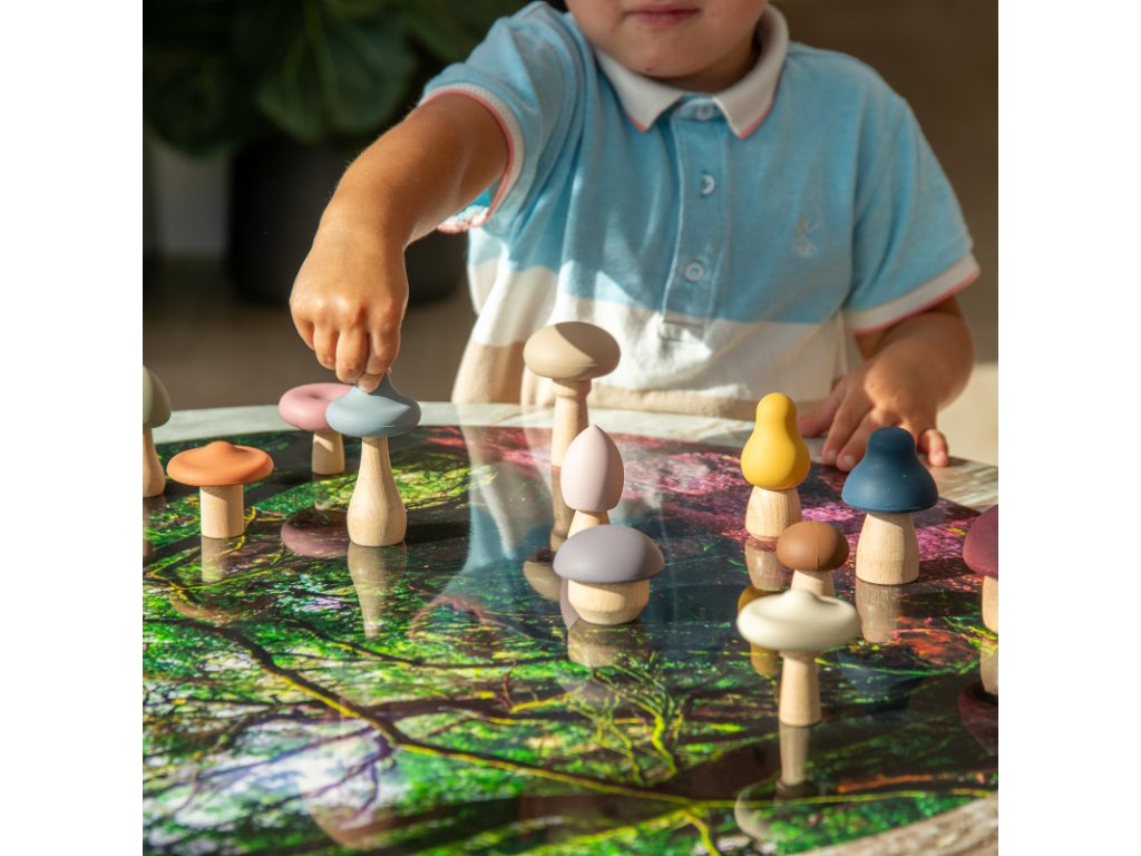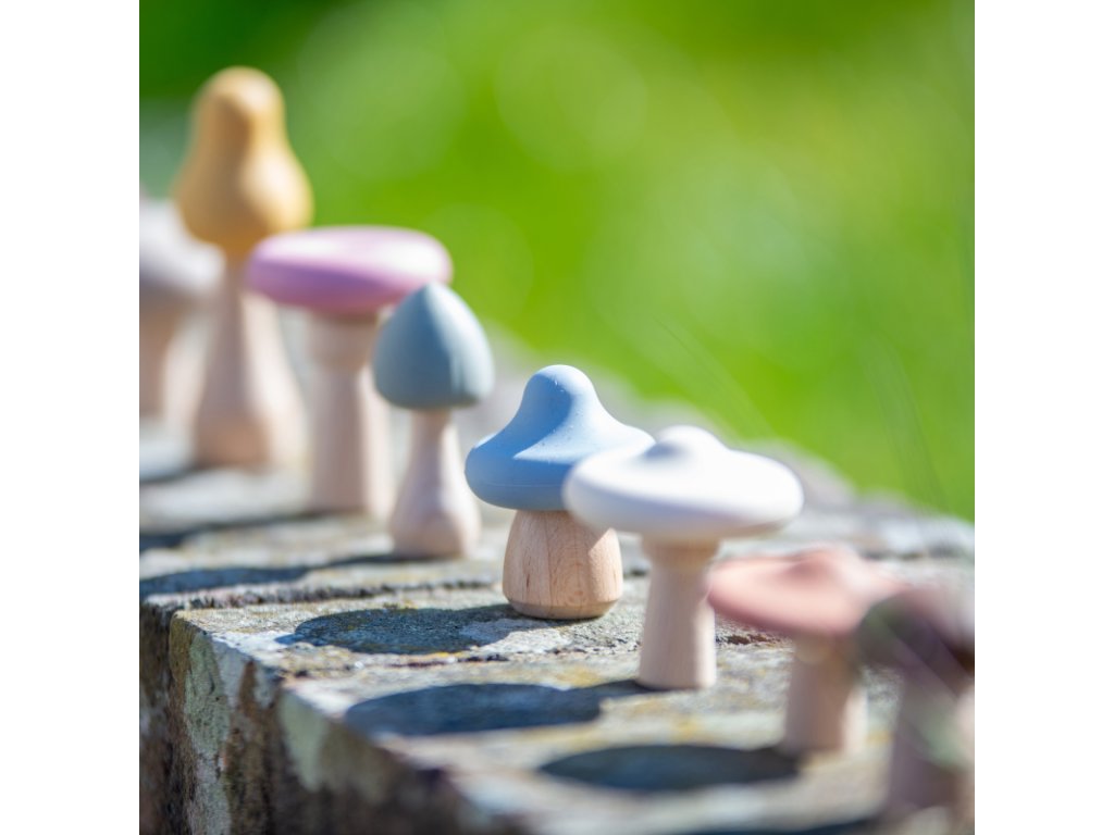 Nádherné houby různých tvarů s dřevěnými stonky a barevnými silikonovými kloboučky, které se dají oddělit a kombinovat. Jsou ideální pro jemnou motoriku a kreativní hru.