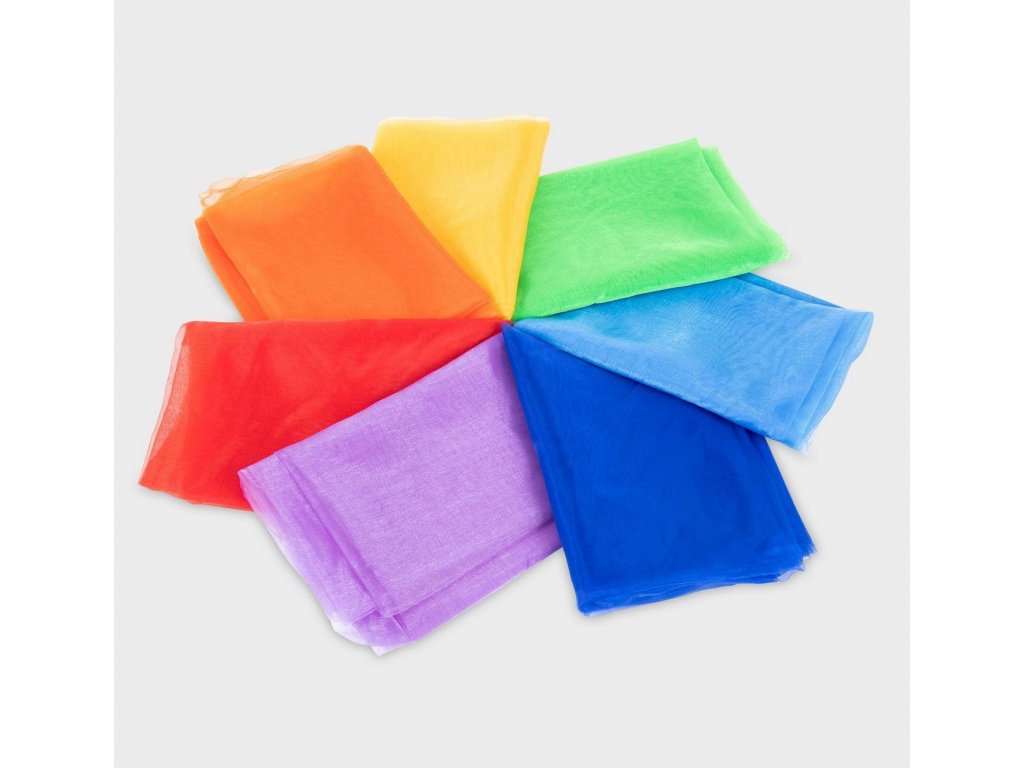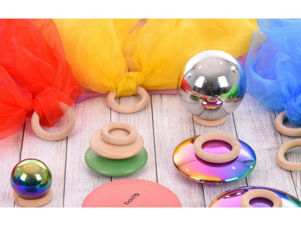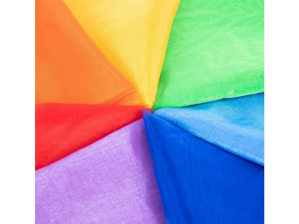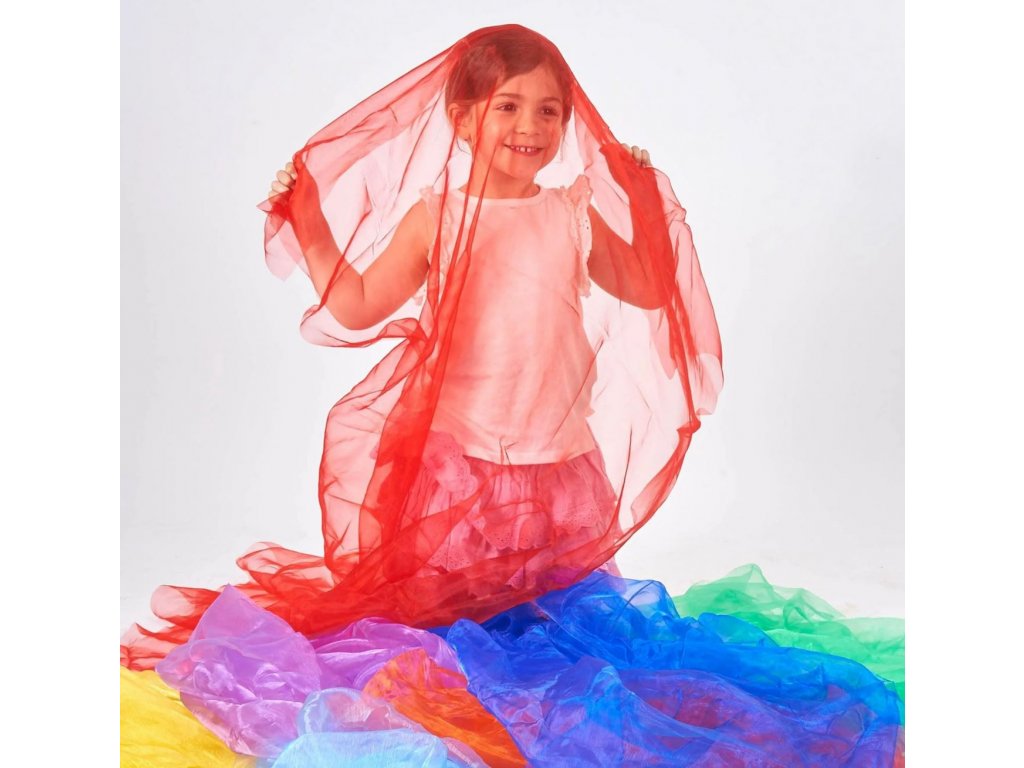 Duhové organzové šátky TickiT® jsou dokonalým materiálem pro stimulaci smyslů, vytvoření krásného doupěte, přidání šmrncu hudbě a tanci nebo dokonce pro mladší děti, aby si mohly hrát a pozorovat. Skvělé jsou také pro tvoření malých světů- někdy představují vodu, les, oheň apod..