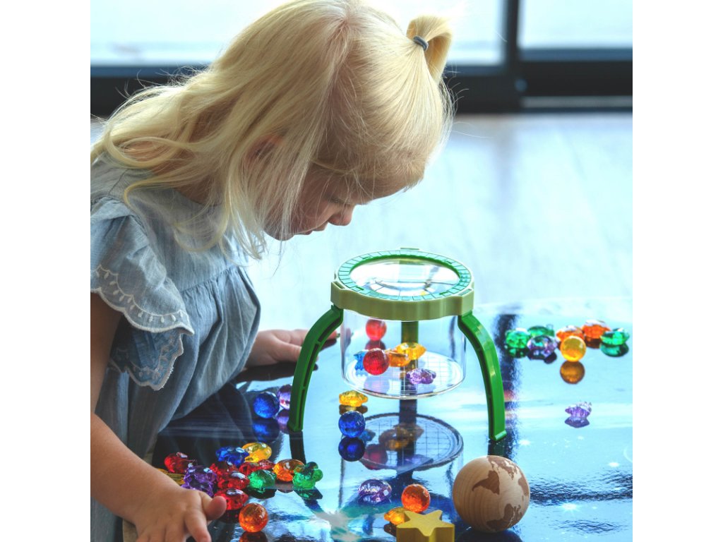Součástí je odnímatelná pozorovací nádobka, která se v případě potřeby našroubuje na lupu, což z ní činí ideální nástroj pro lupu v raném dětství bez použití rukou.