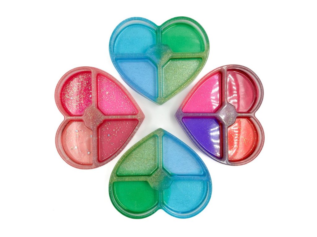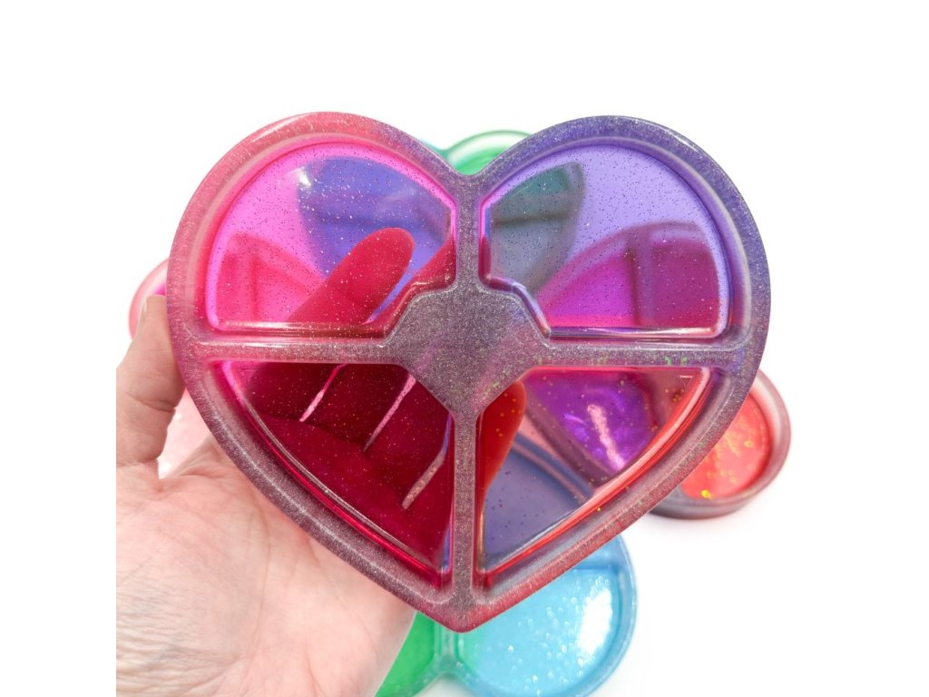 Tácek z pryskyřice ve tvaru srdce využijete při smyslohraní. Děti do nich mohou sypat barevný materiál, vystýlat modelínou, bambulkami, či kineťáčkem.