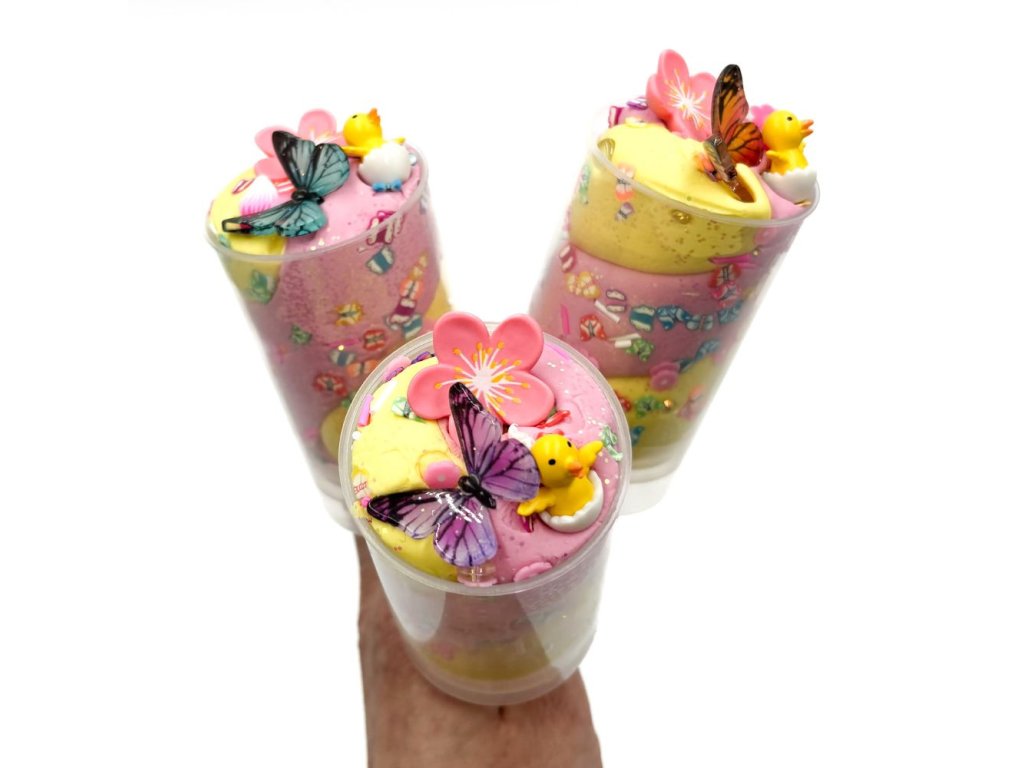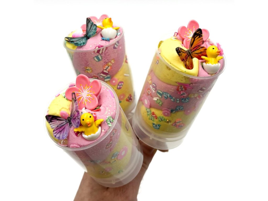 120g měkkoučké dvoubarevné pastelové domácí modelíny, třpytky, konfety, figurka kuřátka, motýlek, kytička