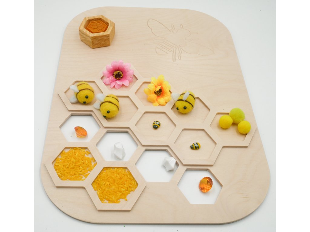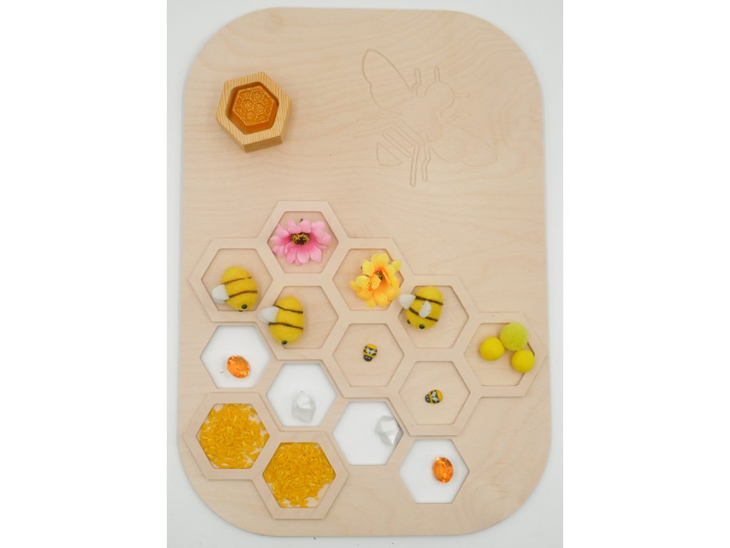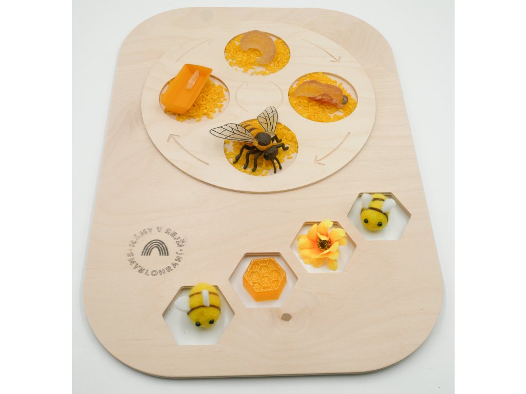 Vkládací desku využijete ve spojení s naším včelím smysloboxem, či jakýmikoli doplňky, které najdete doma. Deska je oboustranná. Z jedné strany je 4 fázový vývojový tácek, který využijete na sadu evolučních figurek, např. včely. Z druhé strany jsou šestihrany - včelí úlíky pro vkládání. Deska obsahuje otvory pro vsypávaní a vhazování smyslového materiálu.