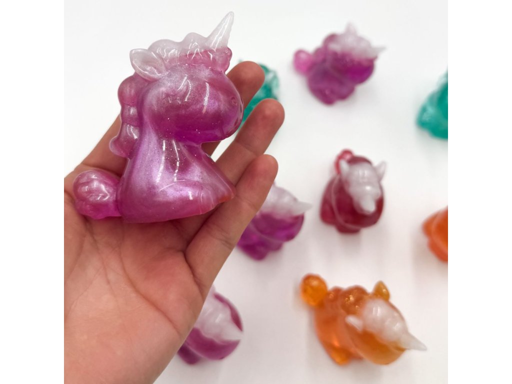 Krásný jednorožec z pryskyřice. Děláme je v různých barvách a s různými třpytkami. Pokud máte barevné přání, napište do poznámky. Pokud zrovna nebude skladem, počítejte s delším dodáním. Jinak volíme dle skladových zásob.
