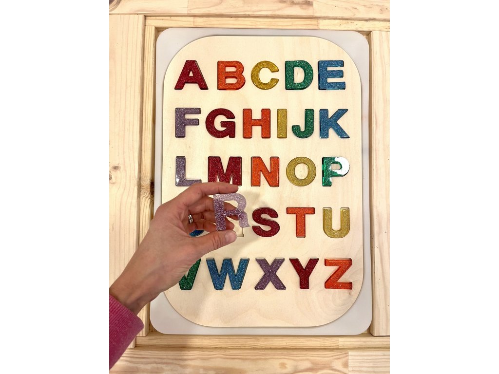 Vkládací desku využijete ve spojení s naší pryskyřicovou abecedou či na vysypávání smyslového materiálu. Děti se tak hravou formou seznámí s písmeny.
