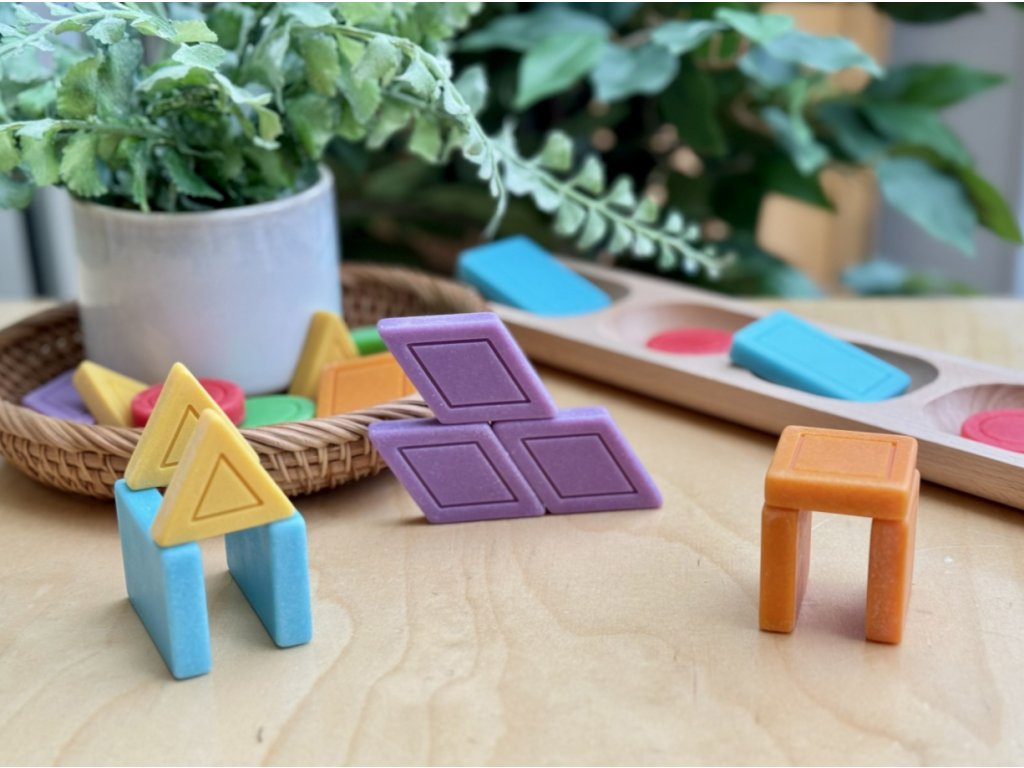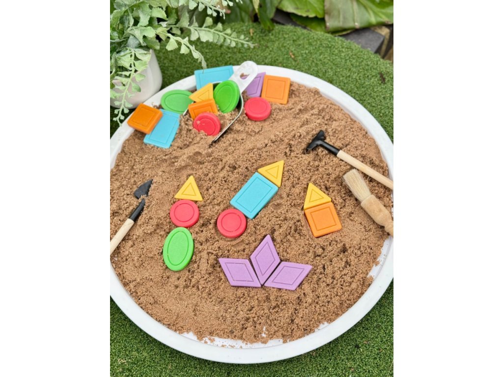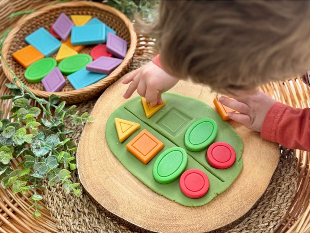 Děti si užijí kopírování a vytváření vlastních opakujících se vzorů a zkoumání symetrie pomocí jednoduchých barevných tvarů. Každý kámen tvaru je z jedné strany hladký a z druhé strany gravírovaný, což je ideální pro senzorickou zpětnou vazbu a otiskování vzorů nebo vytváření mozaik do plastelíny.