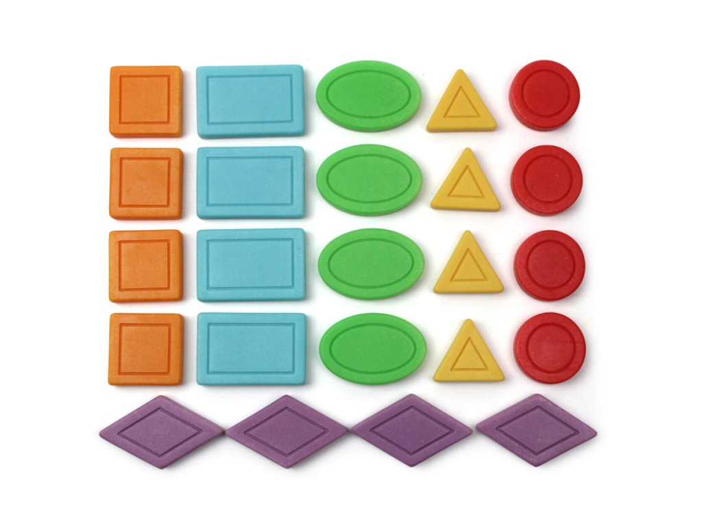 Sada 24 kamenů obsahuje čtyři od každého: červený kruh, žlutý trojúhelník, zelený ovál, modrý obdélník, oranžový čtverec a fialový diamant.