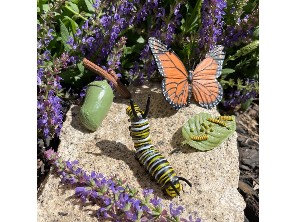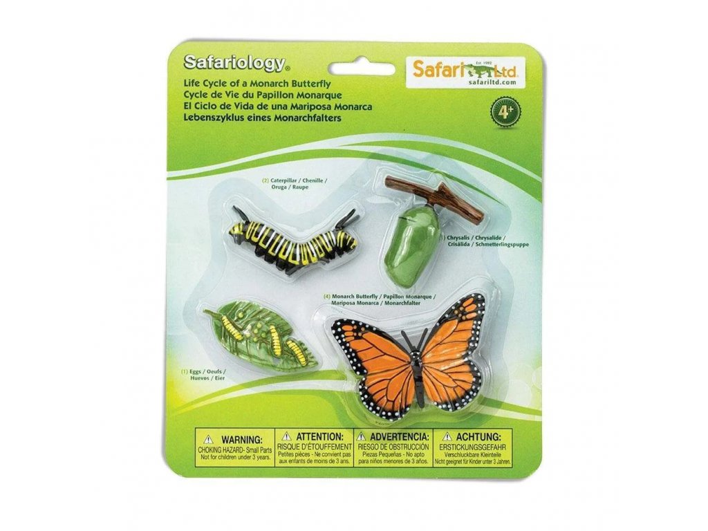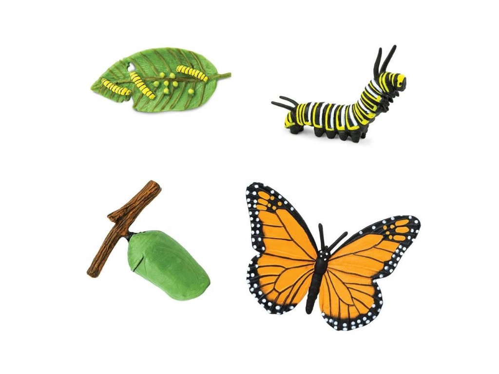 Z téměř neviditelných vajíček se líhnou drobné pruhované housenky. Okamžitě se začnou krmit okolními listy a uchovávají potravu pro nadcházející přeměnu. Po dvou týdnech vytvoří kuklu, ze které se po dalších dvou týdnech vyklube motýl monarcha. Díky těmto Safari Ltd figurkým děti lépe pochopí vyvojová stadia motýla.