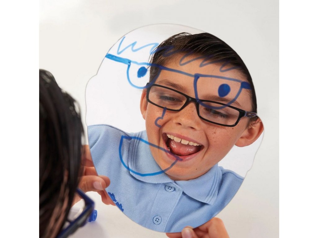 TickiT zrcadlo-emoce představuje interaktivní způsob, jak se vaše dítě učí důležitým dovednostem osobního rozvoje – jako jsou emoce, sebeuvědomění a komunikace. Tato zábavná zrcátka ve tvaru obličeje umožní vašemu dítěti studovat svůj vlastní odraz, dělat legrační obličeje nebo mluvit o tom, jak různé výrazy vyjadřují různé pocity. Lze je použít s fixy na tabuly, takže děti mohou na zrcadlené tváře kreslit, aby viděly, jak by vypadaly s brýlemi, pihami nebo dokonce s knírem!